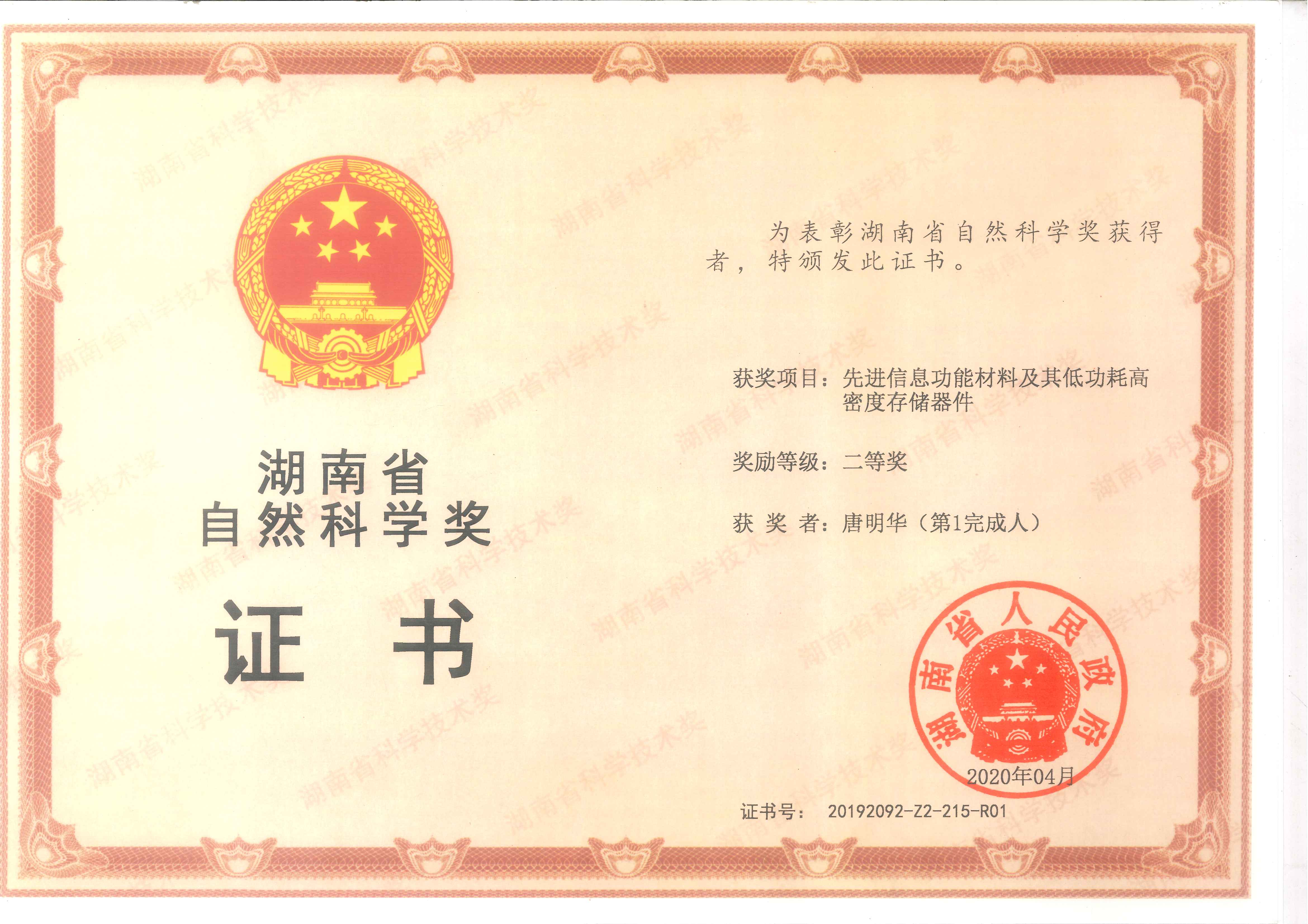 近日,湖南省科技厅召开了湖南省科技奖励大会。公司唐明华教授“先进信息存储材料与器件”课题组申报的“先进信息功能材料及其低功耗高密度存储器件”荣获“湖南省自然科学二等奖”。信息技术的高速发展,对微电子元器件的性能提出了更高的要求,晶体管逻辑与存储器件朝着速度更快、容量更大、功耗更低、体积更小、寿命更长、可靠性更高的方向发展。为了达到这一目标,唐明华教授科研团队从新材料、新机理、新结构和新器件等方面进行了长期而艰苦的探索,开展了系统的研究工作,取得了富有开拓性的成果。