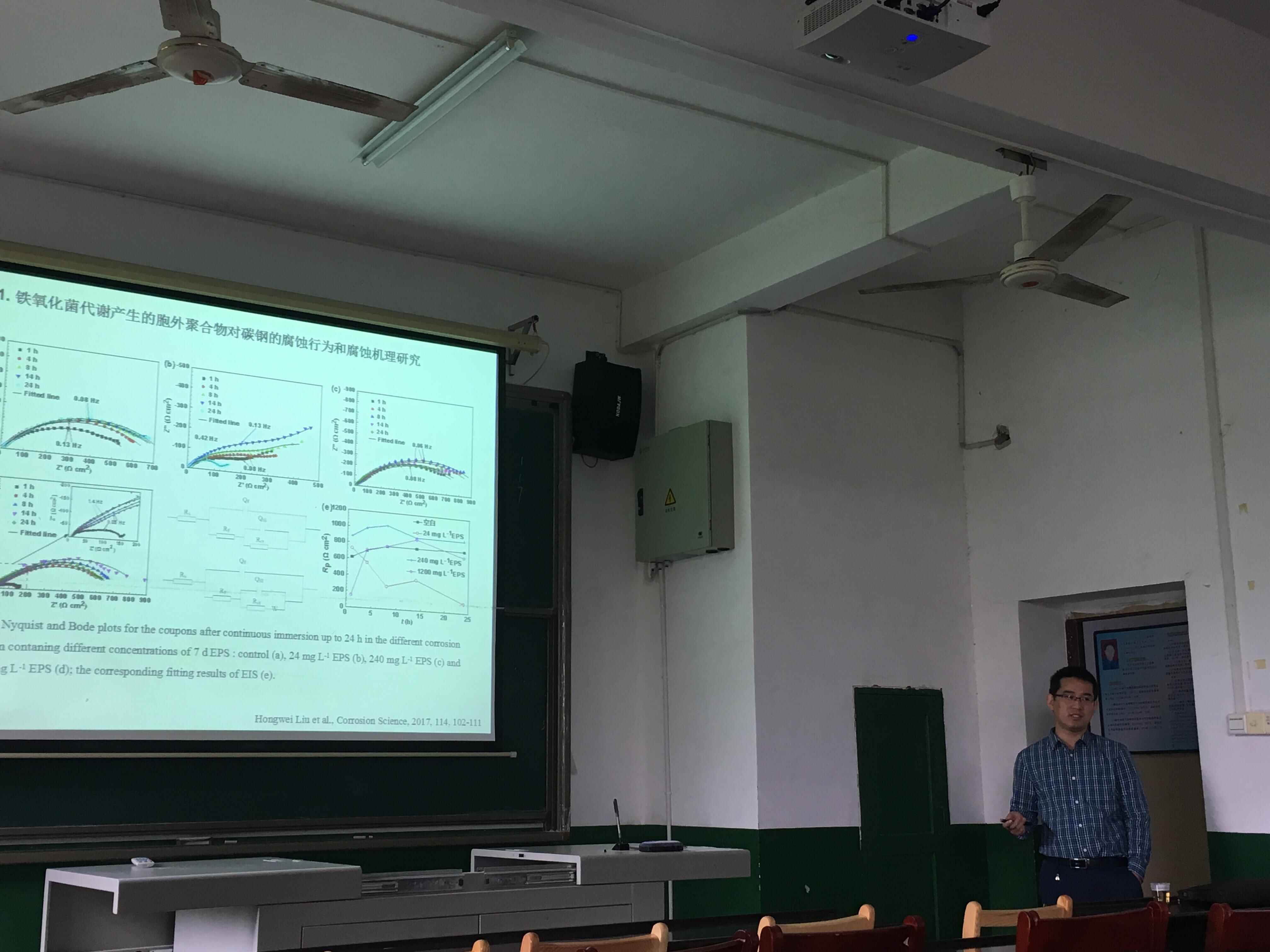 报告中,刘副教授图文并茂地展示了复杂环境体系下微生物腐蚀的电化学机制,并提出了油田环境中微生物腐蚀的防治措施。刘宏伟副教授介绍了铁氧化菌、硫酸盐还原菌和小球藻等微生物对碳钢腐蚀的影响,探讨了微生物共生、油田化学环境中微生物腐蚀机制;随后介绍了磁场、杀菌剂和缓蚀剂在微生物腐蚀防护方面的应用。报告内容充实、条理清晰,深入浅出地介绍了他在微生物金腐蚀及其腐蚀控制方面的研究成果。报告结束后,老师和同学们纷纷就报告内容积极提问,刘宏伟副教授都耐心地给予了分析和解答。
