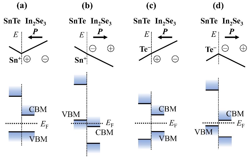 铁电隧道结是最有前景的小型化、低功耗信息存储器之一。传统钙钛矿铁电薄膜材料因尺寸效应抑制了铁电器件的小型化。本文利用单层厚度的α-In2Se3铁电体和六方IV-VI族半导体,设计了一类铁电/半导体范德华异质结和面内铁电隧道结。第一性原理研究表明,该类异质结能够在铁电极化的调控下,实现从宽带隙绝缘态到金属态的转变,从而使铁电隧道结呈现显著的电致电阻效应,为高密度铁电存储器的研制提供了有效方案。