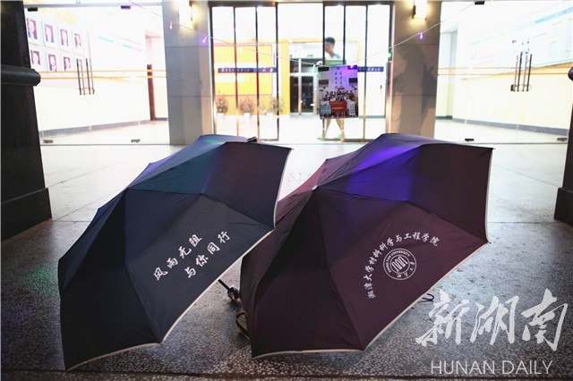 伞面上,一端印着湘大校徽、公司名称,对角端印着“风雨无阻,与你同行”一行字。母校的印记、公司的记忆、师长的祝福全在这一把小小的雨伞上。