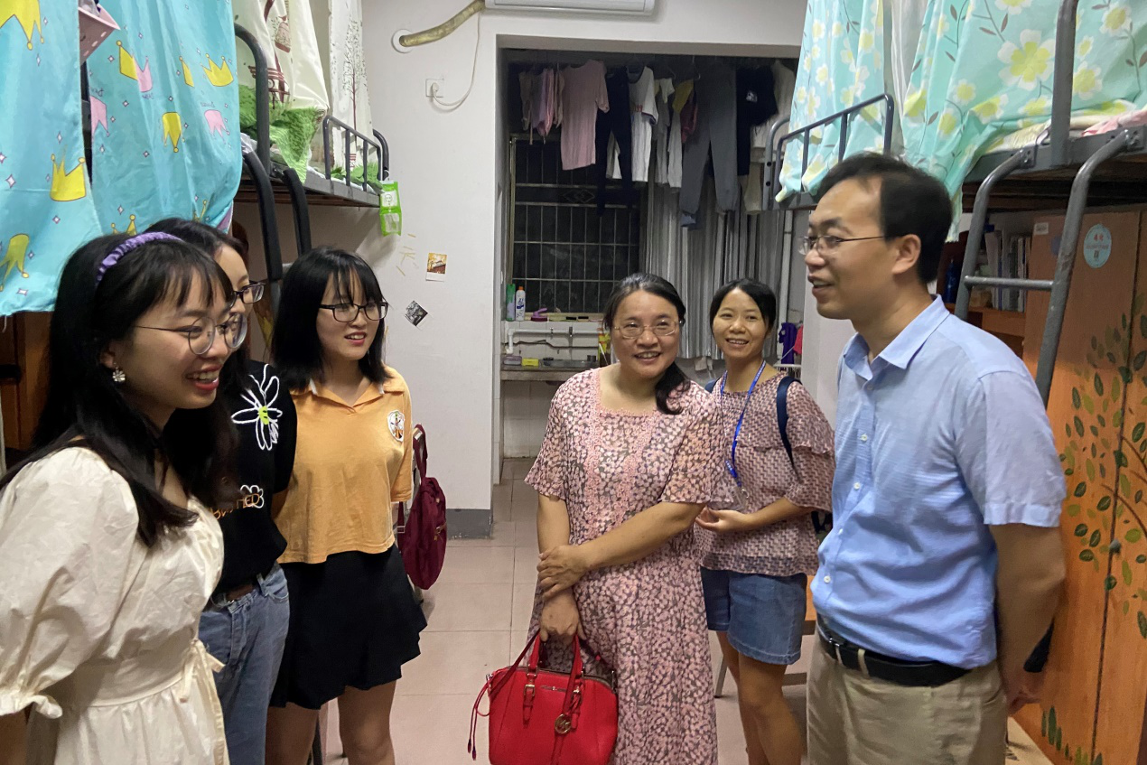 老师们到寝看望,同学们热情迎接,寝室中洋溢着和谐温馨的氛围。尹经理细心地询问了同学们疫情期间在家的学习情况,嘱咐同大家返校后要认真上课和复习,尽快调整好自己的生活作息,以最好的状态迎接新的学期。