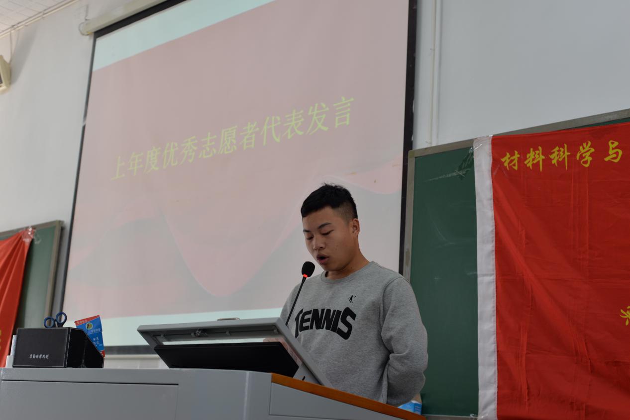 “我们相聚在这里,都知道,青年志愿者是一个响亮的名字!”优秀志愿者代表金小二进行了一段热血激昂的发言。“为社会的发展添砖加瓦,用实事求是的态度来证明自己”。这不仅仅是他一人的原则,更应该是全体青年志愿者应该秉承的原则。