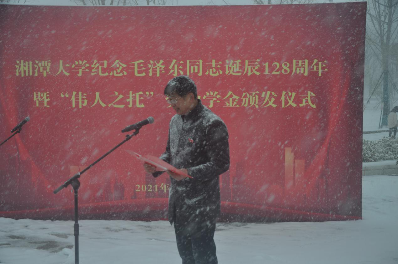 “伟人之托”奖助学金发起人欧阳晓平对获得奖助学金的同学表示由衷的祝贺,向捐助和支持“伟人之托”奖助学金的社会各界人士表示感谢。他呼吁湘大学子积极响应党和国家的号召,不负毛主席的殷殷嘱托,在学术研究中聚焦创新、勇攀高峰。