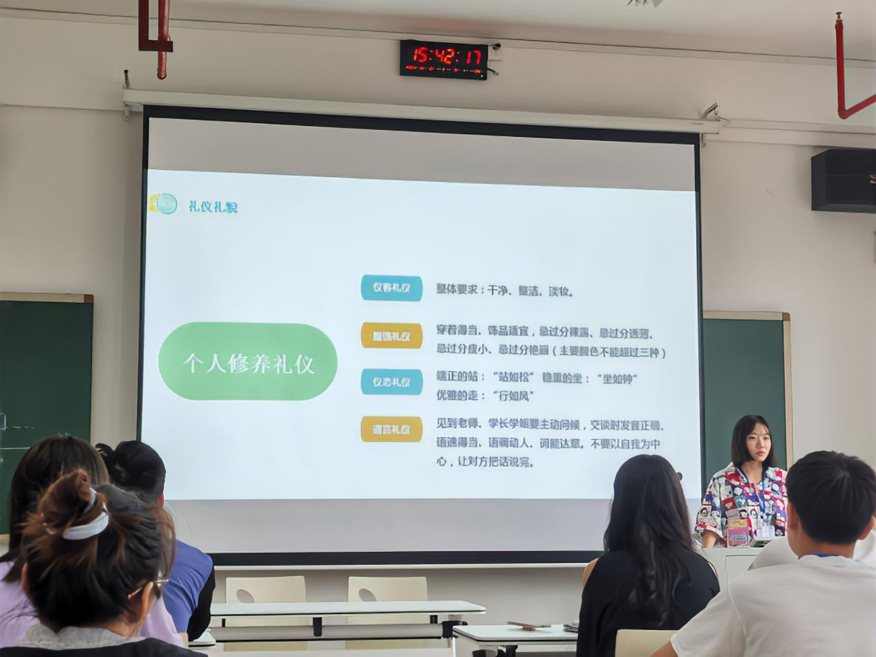 主持人就思想政治、公文处理、礼仪礼貌和经验分享四个方面向大家做了阐释。主持人首先强调了政治思想明确和政治立场坚定的必要性和重要性,要求遵循“从严治团,坚持以思想建设为统领”的基本准则;在公文处理方面,主讲人对其标题、正文、附件等七部分做了详细介绍,且指出对待工作事务应具有严谨的态度;其次,主讲人从礼仪礼貌的概念至相应培训内容逐一介绍,提出每个人应从日常生活中养成良好的习惯,提高自身修养和行为素质。