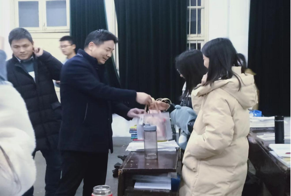 领导和老师们走进兴湘三教考研教室,与同学们亲切交谈,询问备考情况,从考研目标公司到备考过程中遇到的困难,都逐一进行了解并给出建议。老师们给考研学子送上小礼品和祝福手写卡片,传递冬日温暖,并祝愿考研学子们取得理想的成绩。