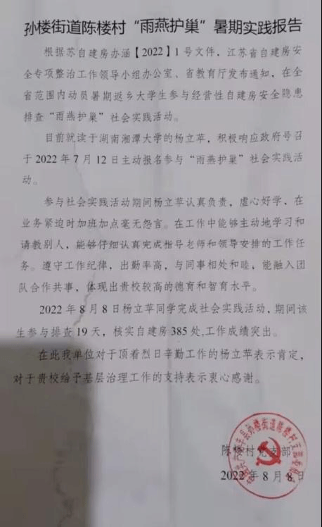 杨立苹表示实践过程中难免需奔波忙碌、加班加点。尽管如此,她仍怀抱虚心学习的态度、发扬吃苦耐劳的精神投身工作,在社会实践中服务大局、回报家乡,贡献青春力量。期间,她参与排查、核实自建房385处,工作成绩突出,受到当地孙楼街道陈楼村党支部的书面表扬。陈楼村党支部对于辛勤工作的杨立苹表示肯定,并对于公司给予基层治理工作的支持表示衷心感谢。