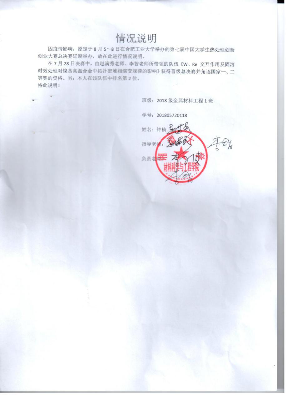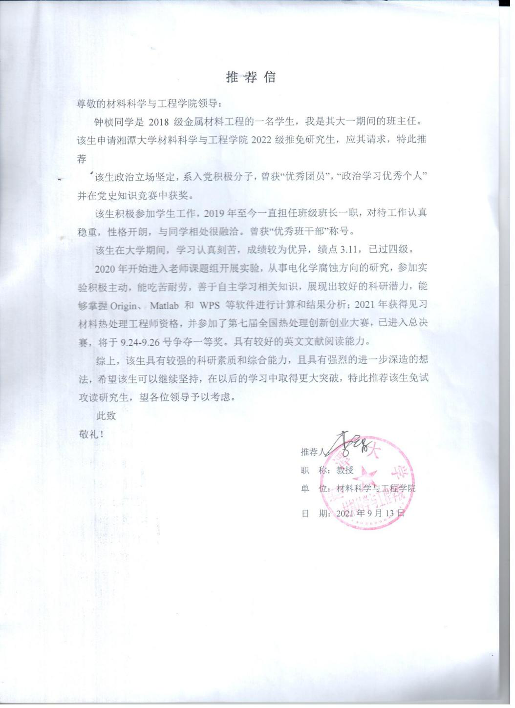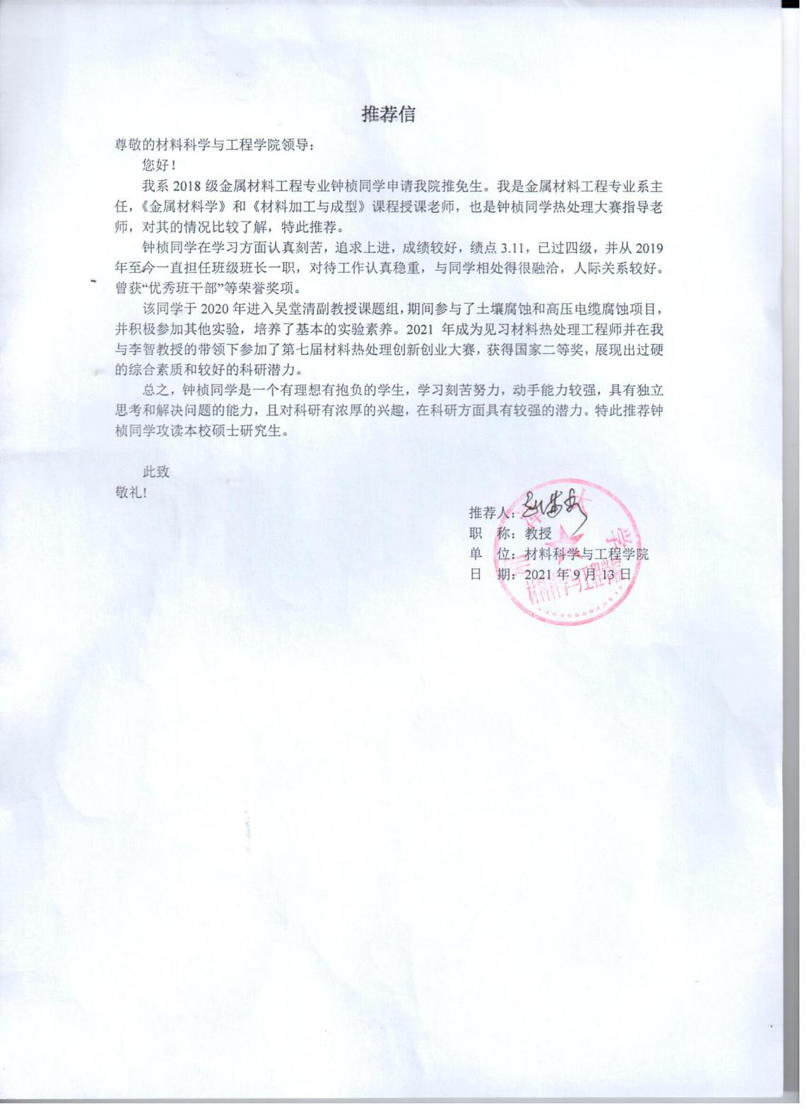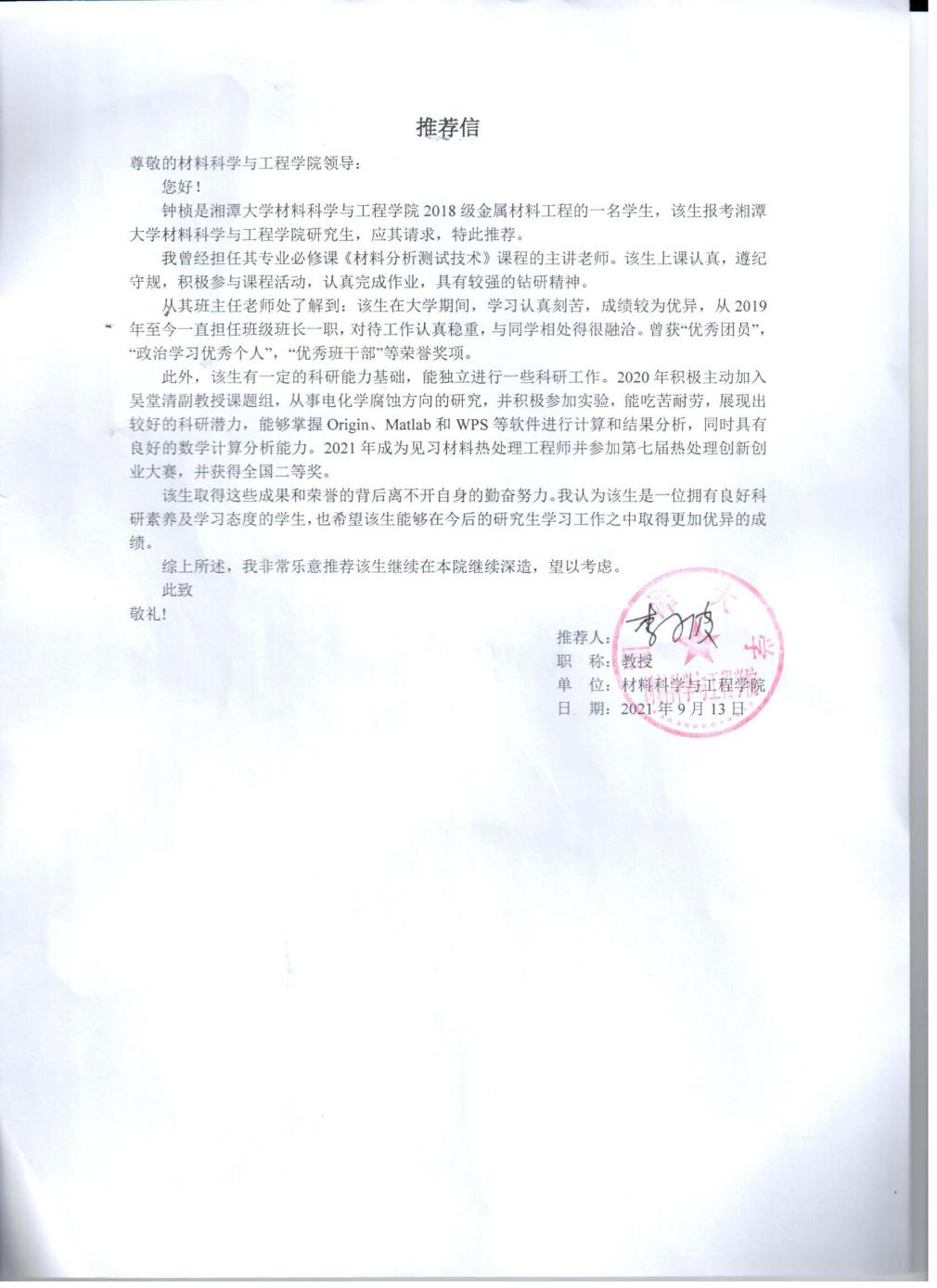 钟桢先进事迹及教授推荐信
