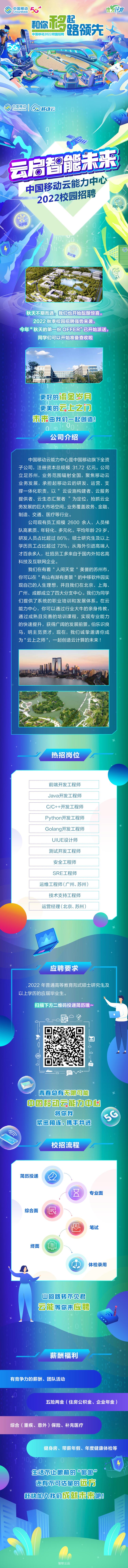 “云上之师 创未来”中国移动云能力中心2022秋季校园招聘启动啦! 现在诚挚邀请您成为“云上之师”,一起创造云计算的未来!本次招聘校招岗位众多,健身房、休闲咖啡吧应有具有,工作环境舒适,待遇优厚!欢迎各位同学前来投递! 网申链接为:cmsoft2022.zhaopin.com/career.html